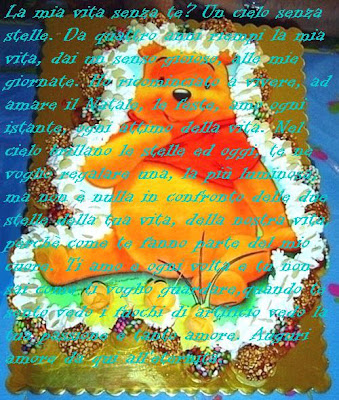 La mia vita senza te? Un cielo senza stelle. Da quattro anni riempi la mia vita, dai un senso gioioso, alle mie giornate. Ho ricominciato a vivere, ad amare il Natale, le feste, amo ogni istante, ogni attimo della vita. Nel cielo brillano le stelle ed oggi, te ne voglio regalare una, la più luminosa, ma non è nulla in confronto delle due stelle della tua vita, della nostra vita, perchè come te fanno parte del mio cuore. Ti amo e ogni volta e tu non sai come ti voglio guardare,quando te sento vedo i fuochi di artificio vedo la tua passione e tanto amore. Auguri amore da qui all'eternità.